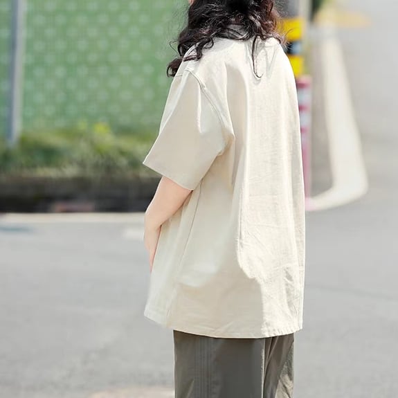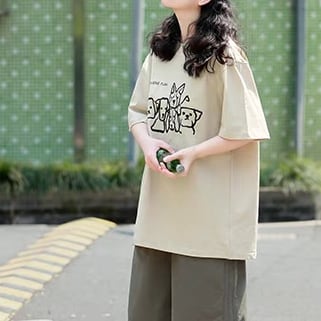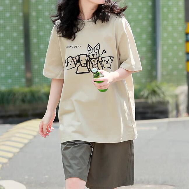ゆるっと愛らしい4匹の犬たちが並ぶ、手描き風プリントが目を引くTシャツ。