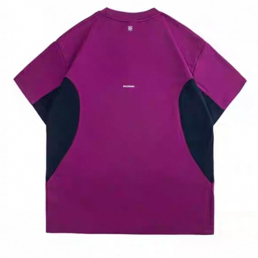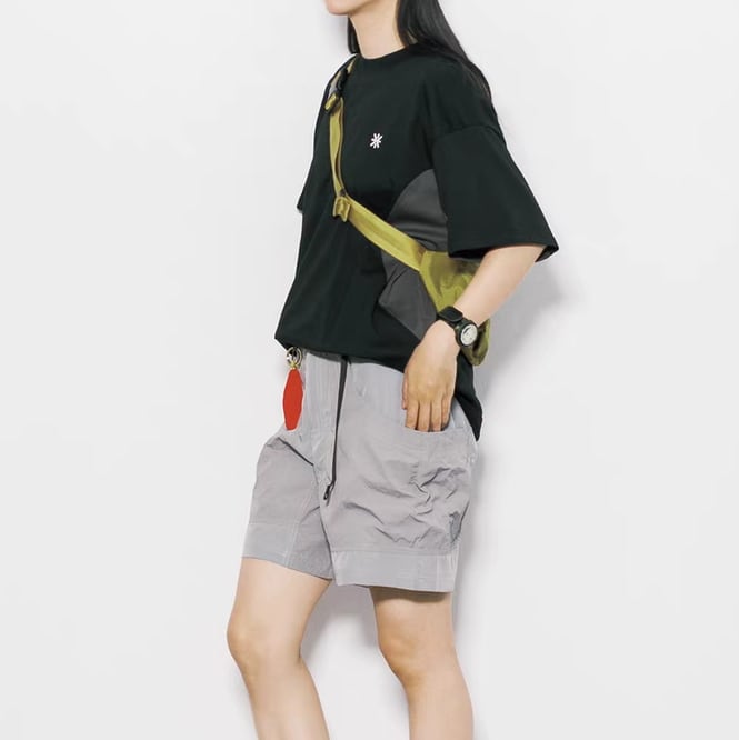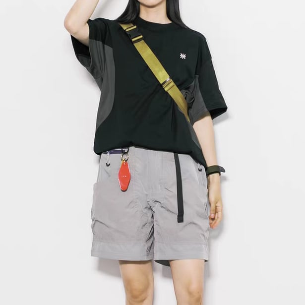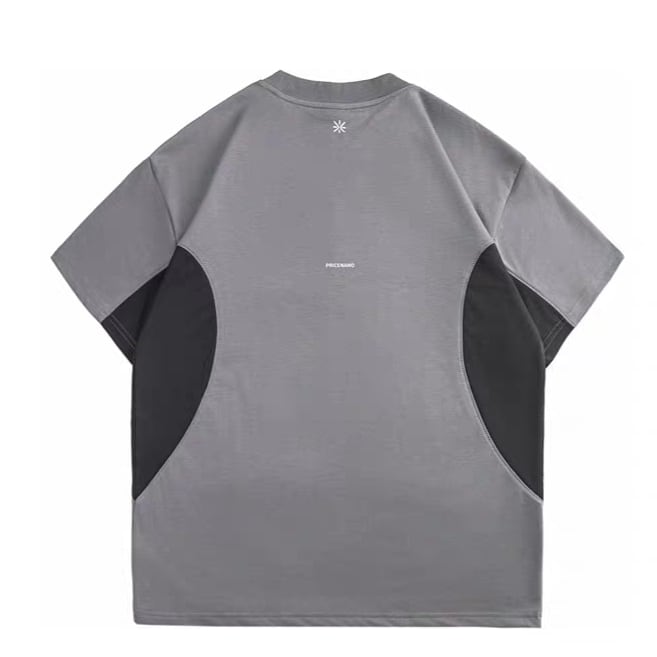 大胆なカラーブロックデザインが目を引く、アウトドアライクなTシャツ。