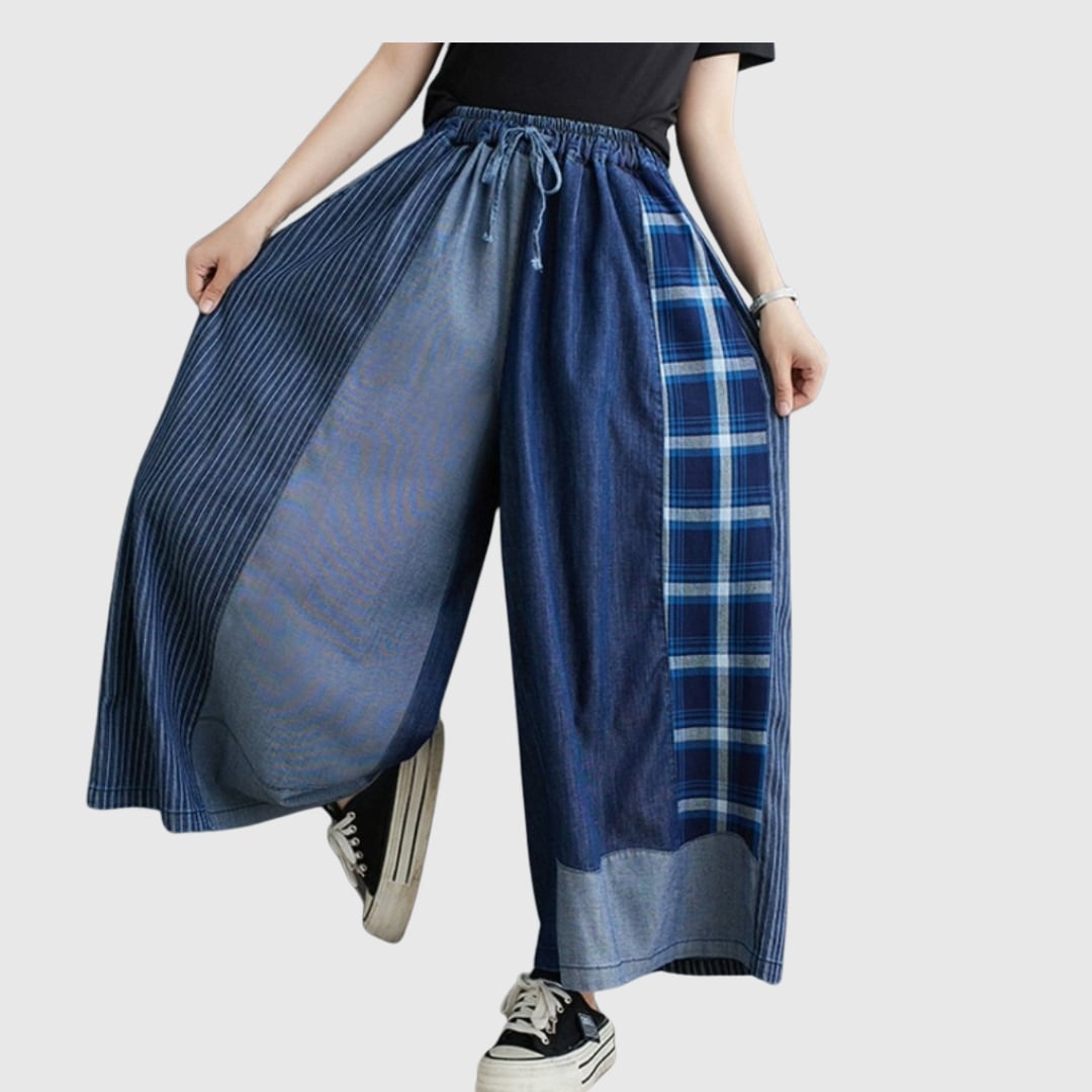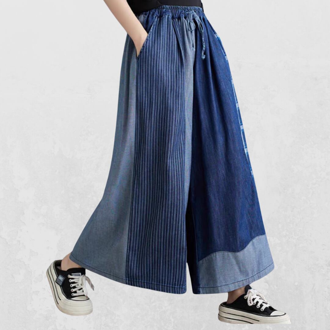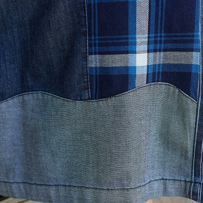 異なるデニム生地をパッチワーク風に組み合わせた、目を惹くデザインのワイドパンツ。