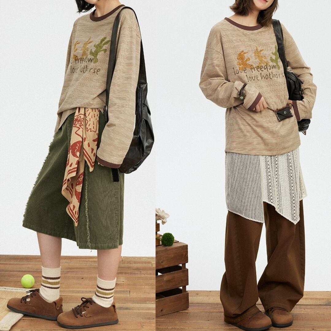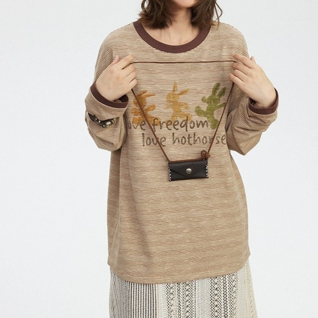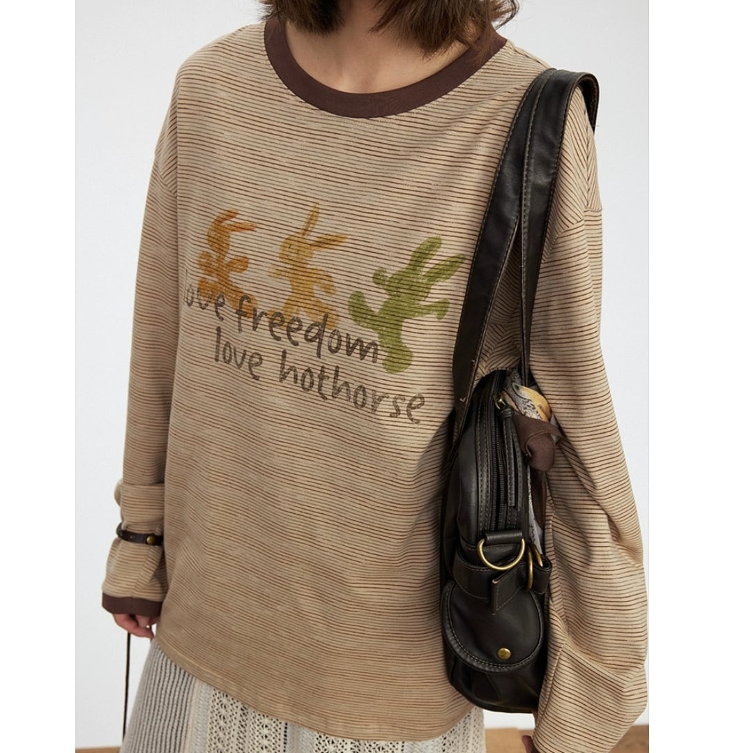 ナチュラルなベージュの細ストライプに、フロントには森を駆ける動物たちの遊び心あふれるプリント。