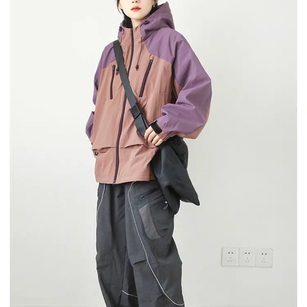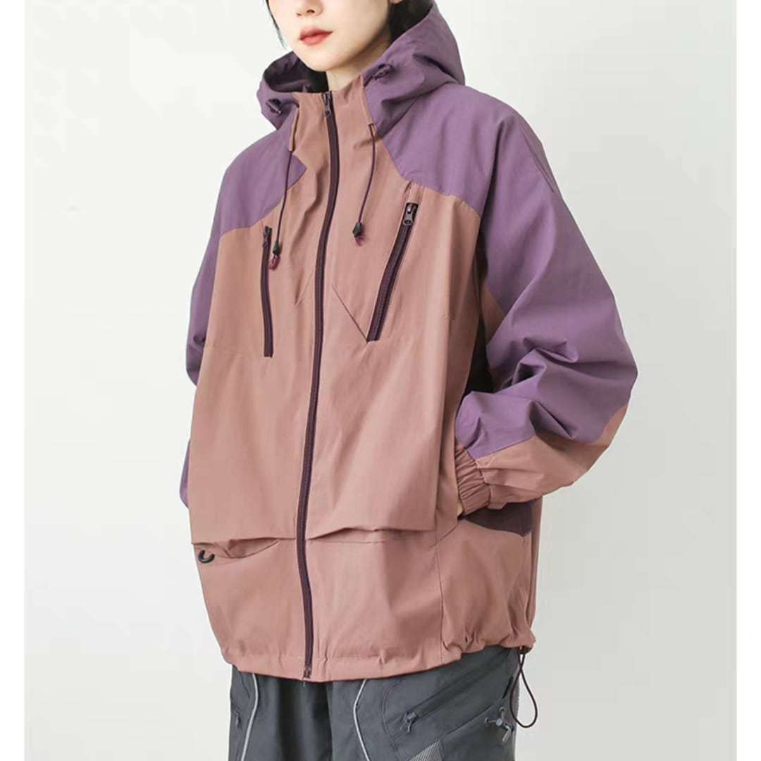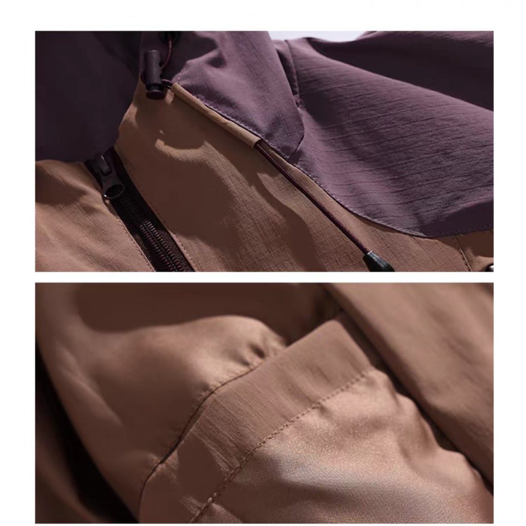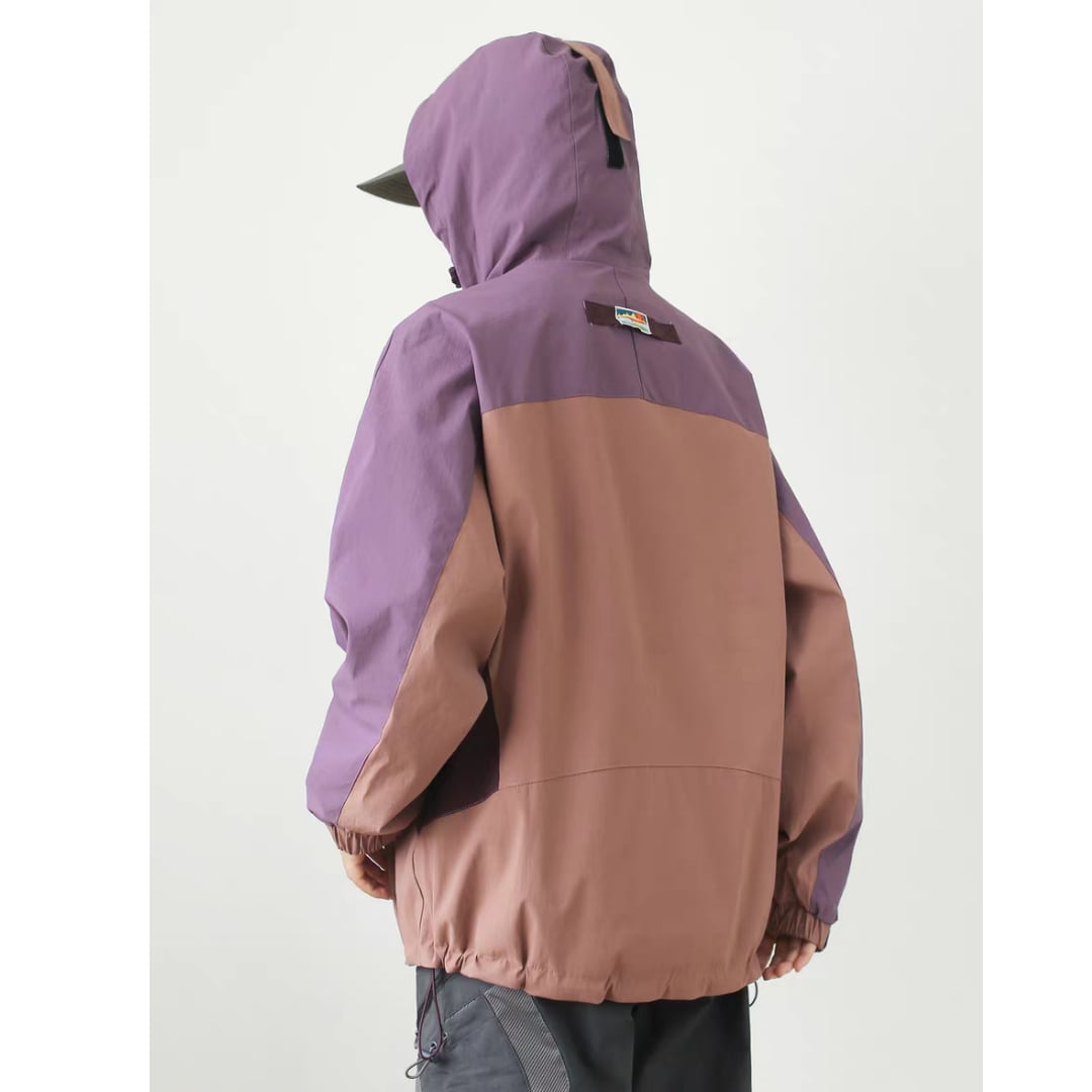 バイカラーの切り替えデザインが目を引き、アウトドアスタイルをスタイリッシュに演出します。防風性に優れた素材とフード付きの仕様で、ハイキングやキャンプなどアクティブなシーンにも安心。ゆったりとしたシルエットで重ね着もしやすく、タウンユースでも映える万能アウターです。