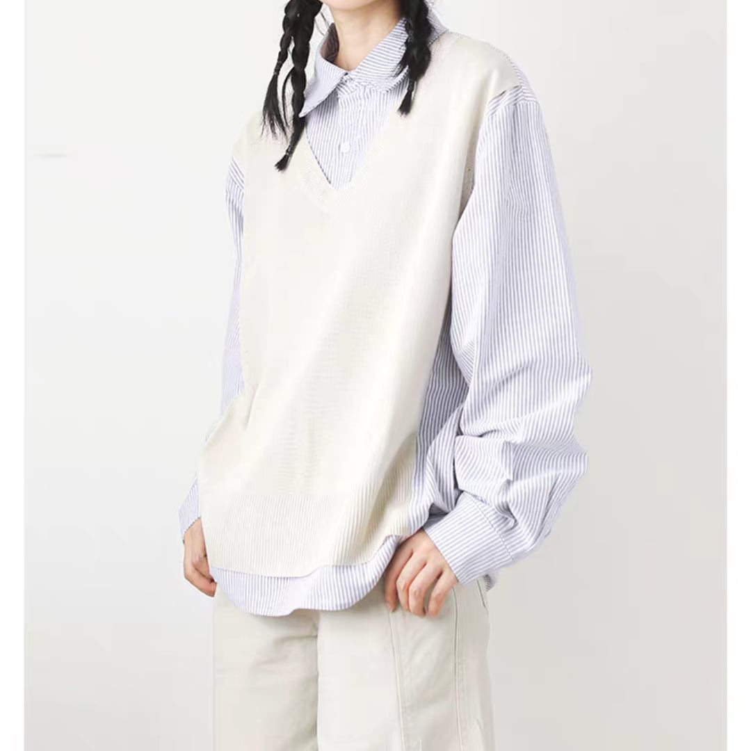 ストライプシャツにニットベストを重ね着したような、トレンド感のあるレイヤードデザイントップス。ゆったりとしたシルエットで抜け感を演出し、パンツにもスカートにも合わせやすい一枚。