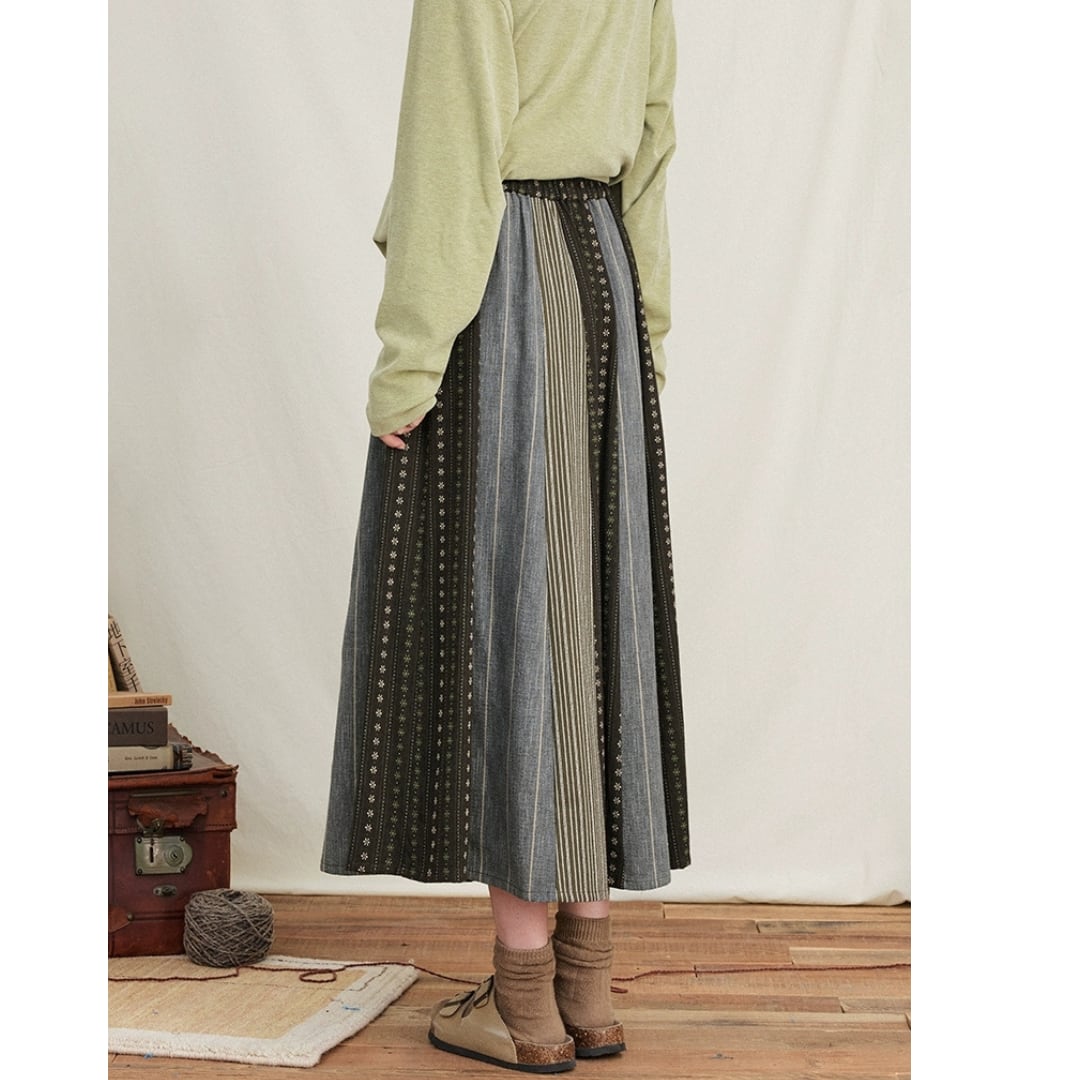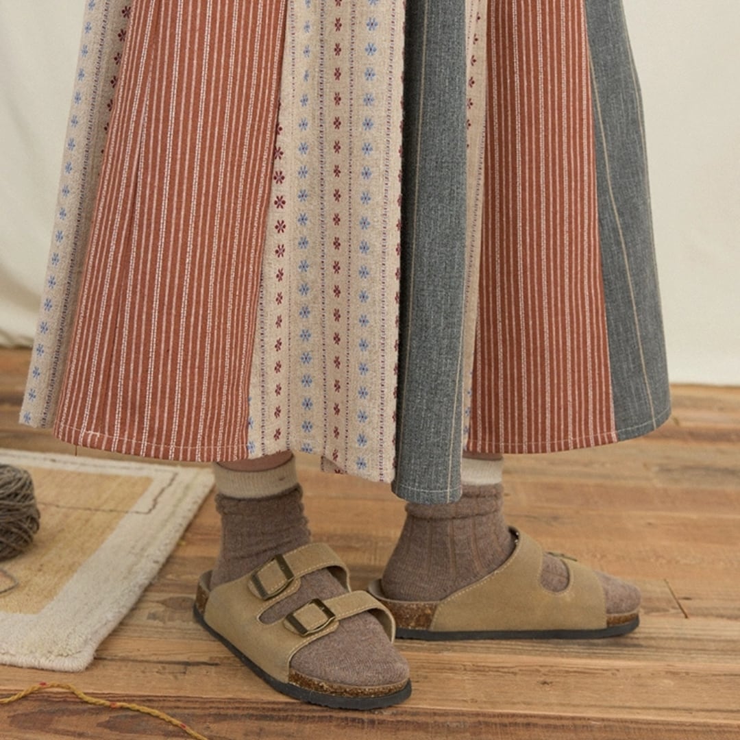 異なるストライプ柄や小花モチーフを組み合わせたマルチパターンデザインが、動くたびに立体感と表情をプラスします。