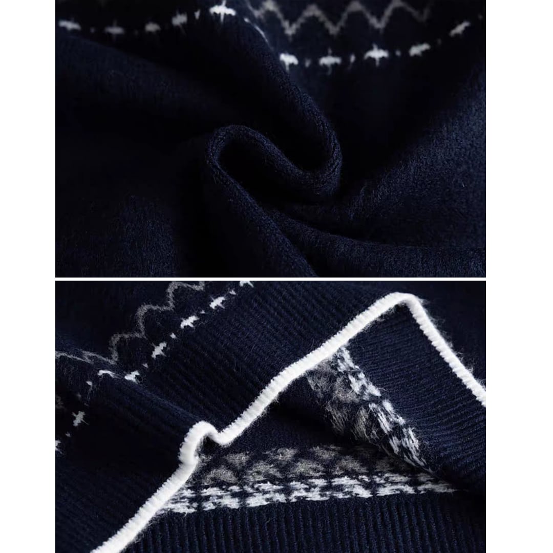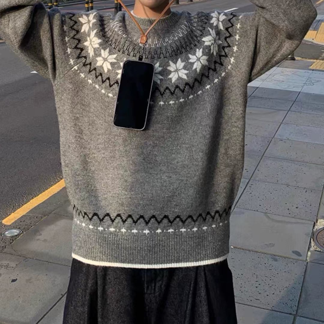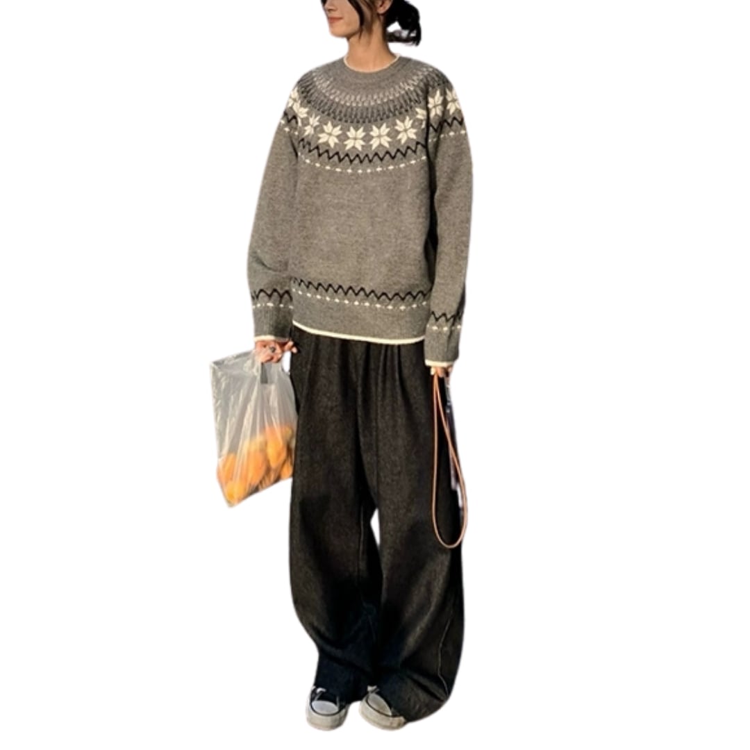 冬の定番、ノルディック調の雪柄をあしらったクルーネックセーター。