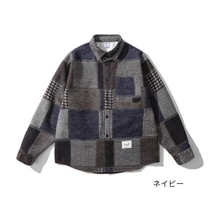 異素材を織り交ぜたパッチワークデザインが魅力のウールライクシャツジャケット。