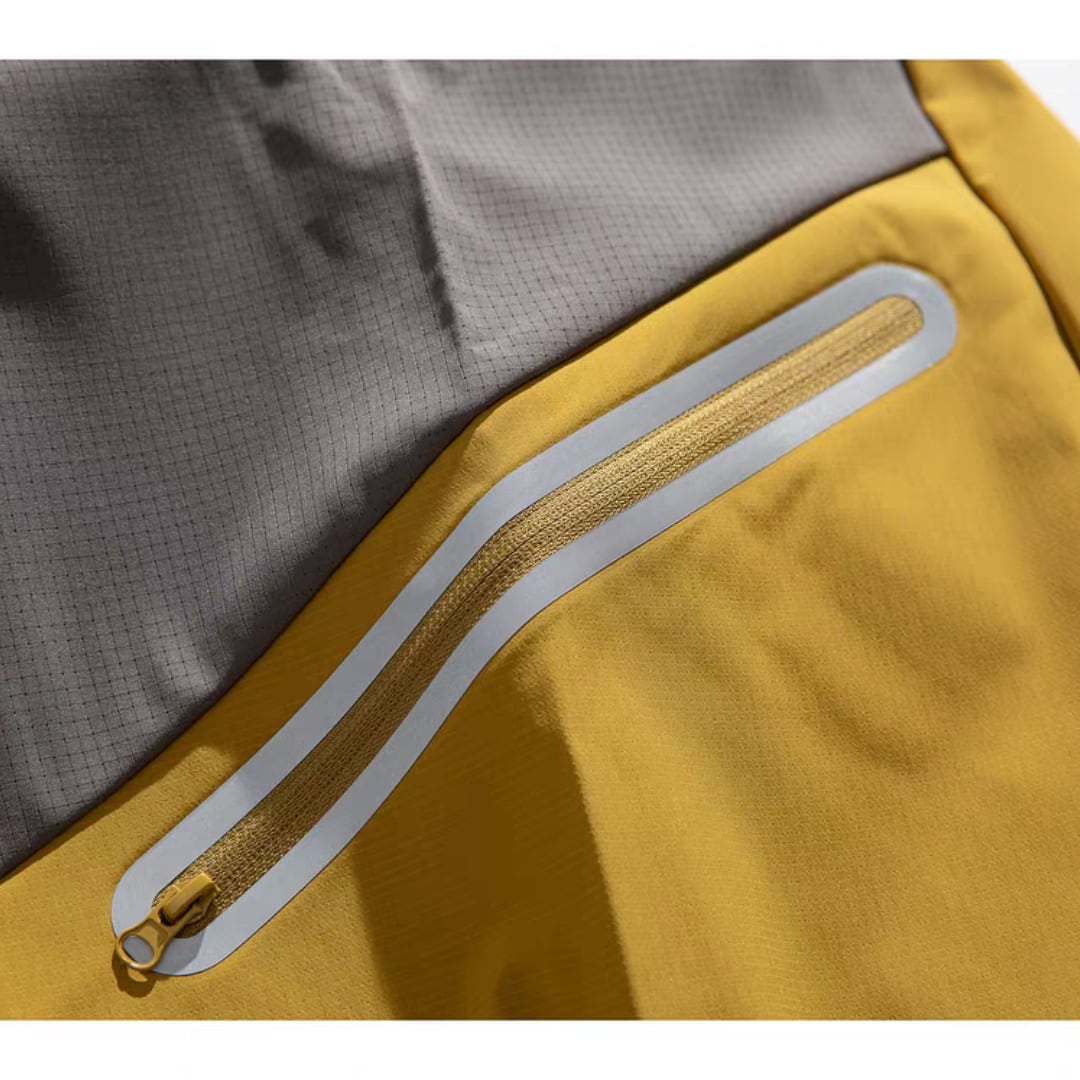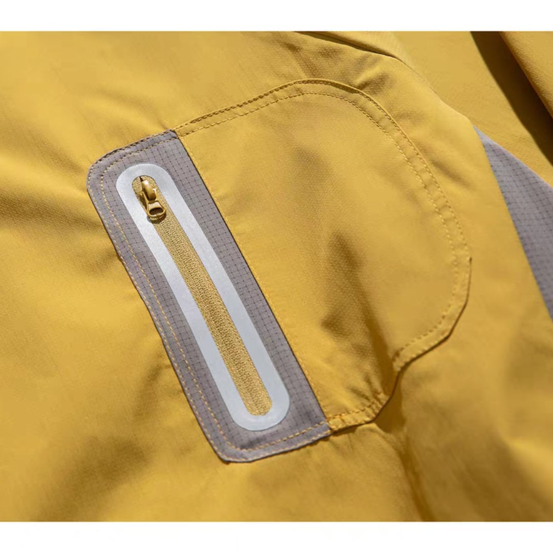 胸元のファスナーポケットや袖・裾のドローコードなど、