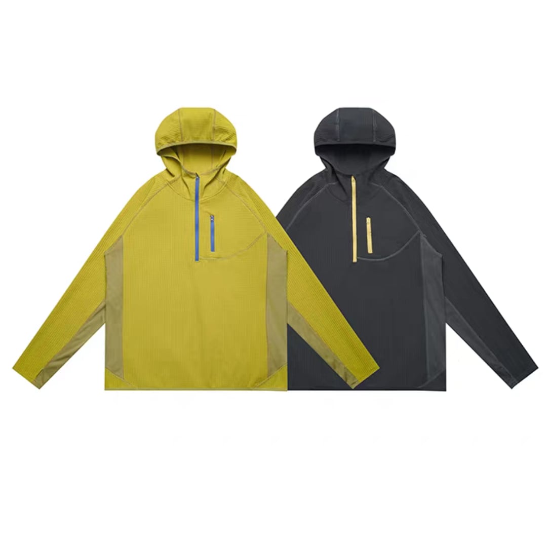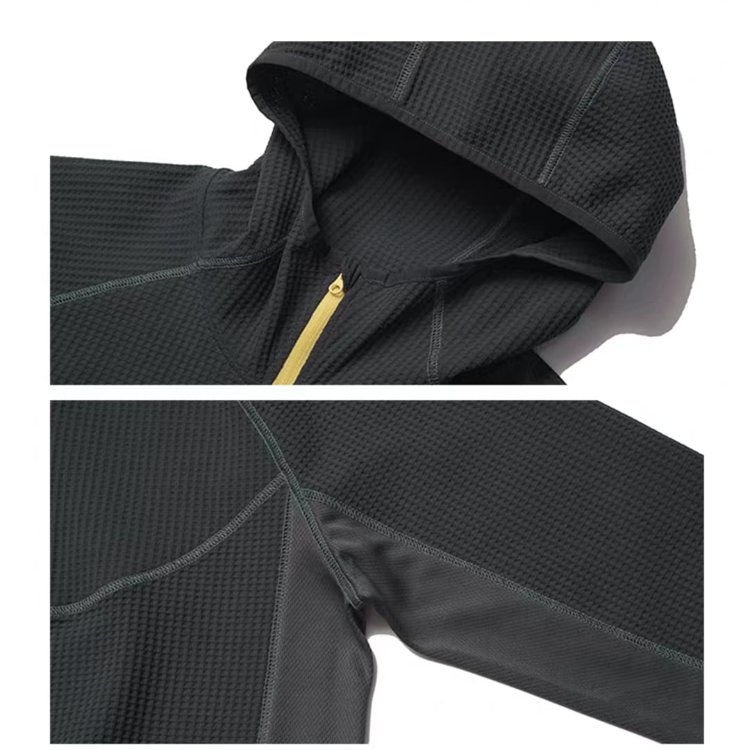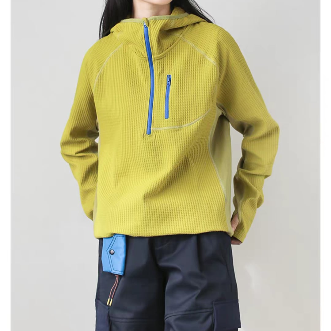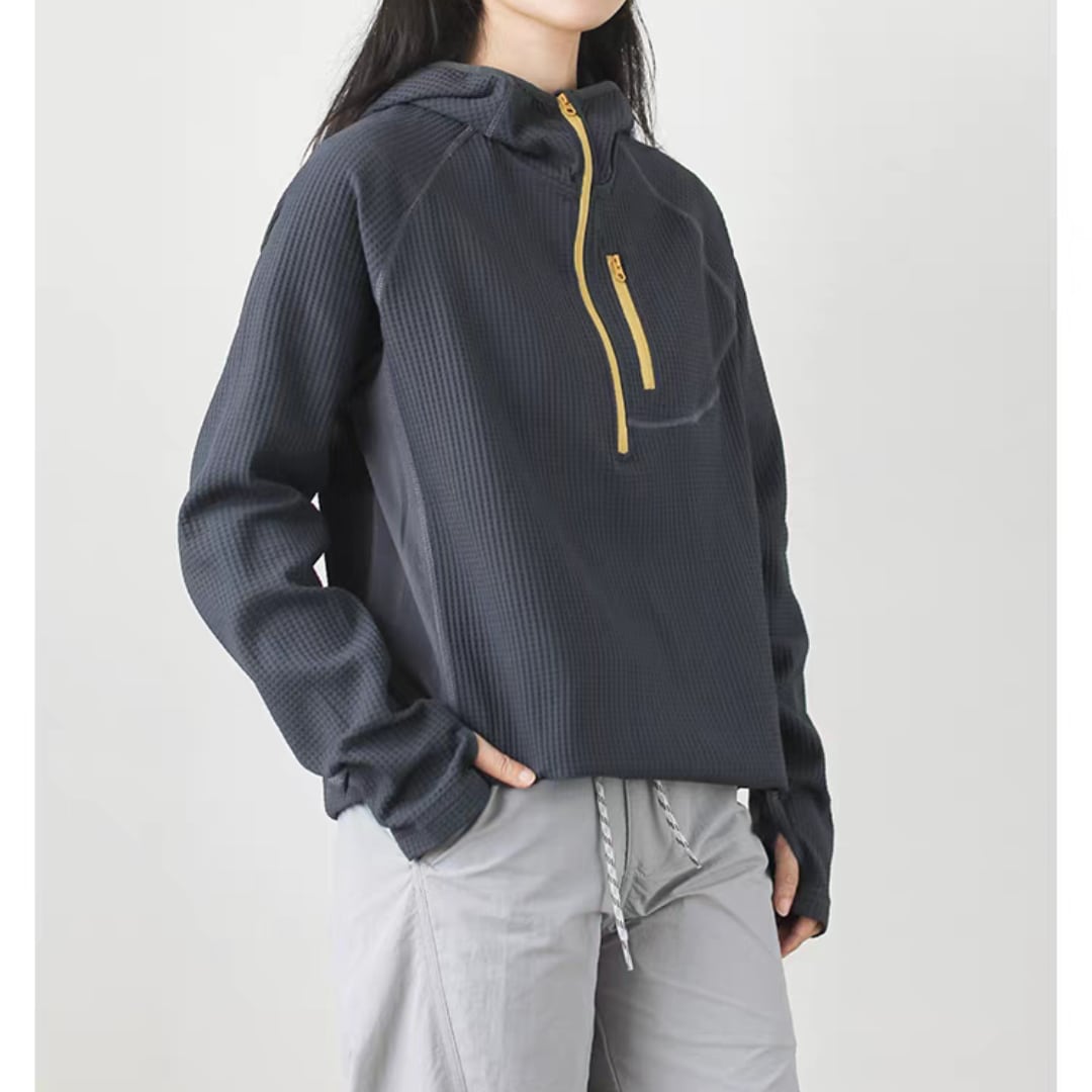 カジュアルでありながらスタイリッシュな印象を与える、ワッフル編みハーフジップフリースパーカーです。ハーフジップデザインにより、気温や気分に合わせて調整が可能です。