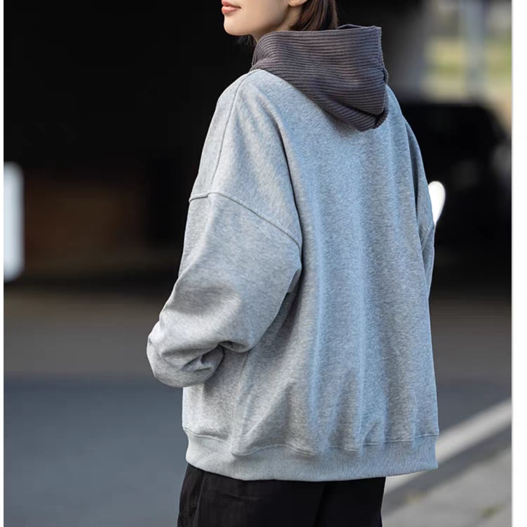 リブ編みの異素材フードがポイントで、