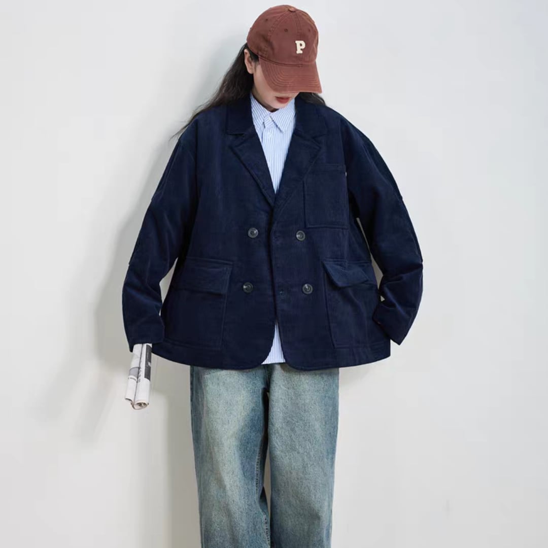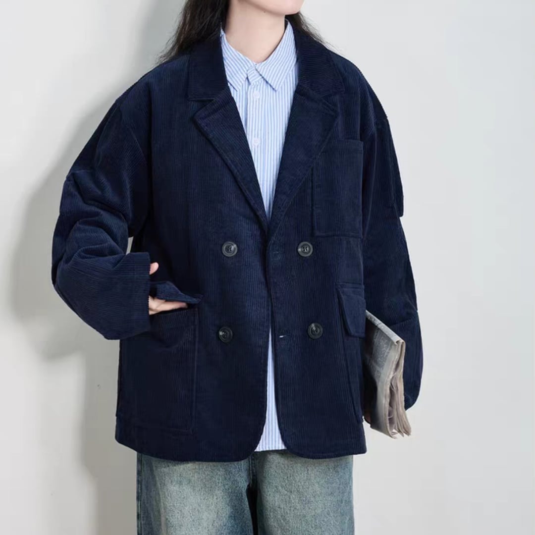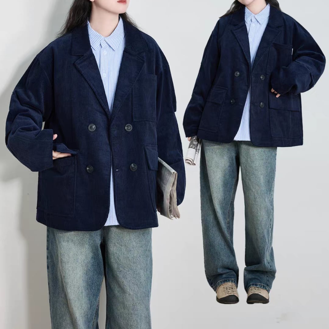 ゆったりとしたシルエットとダブルボタン仕様で、