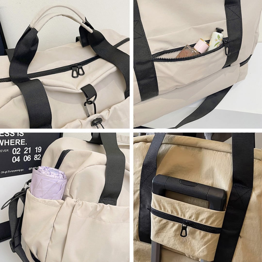 スーツケースのハンドルに通せる背面ポケット付きで、移動中もずれにくく安心。